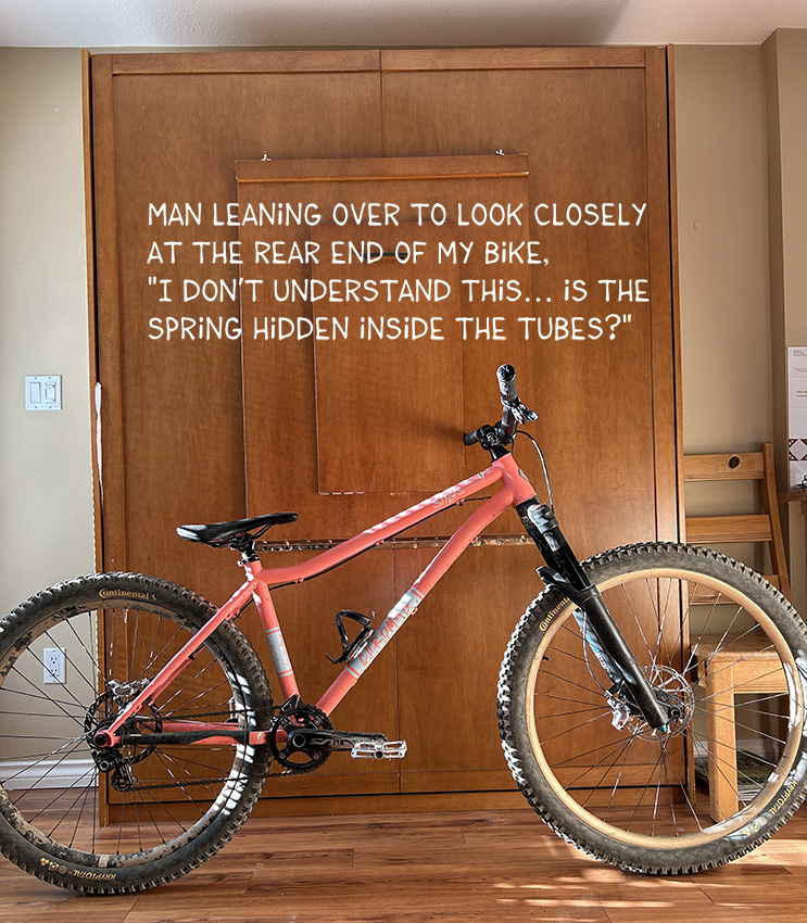 Man leaning over to look closely at the rear end of my bike, “I don’t understand this… is the spring hidden inside the tubes?”