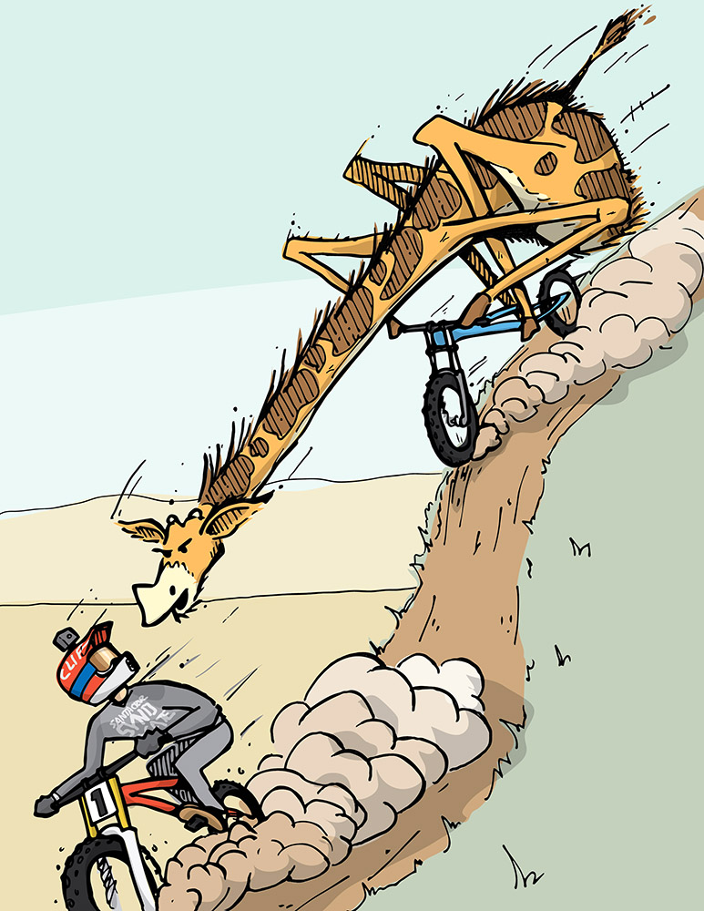 Before meeting Greg I listened to a podcast that had him as a guest. I’d recently started watching World Cup Downhill racing and was only beginning to learn about his amazing career as the greatest downhill racer of all time. On the the podcast he told a story of a giraffe chasing him while he was riding near his home in South Africa. Something about the way he told the story clicked for me and with the podcast still playing I drew a cartoon of the event. Greg liked the drawing on social media and we started chatting.