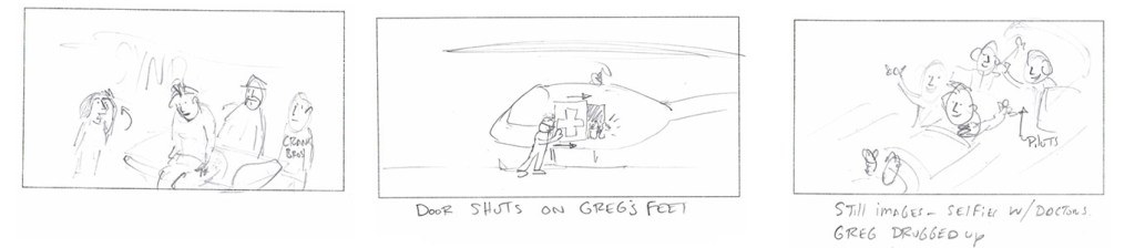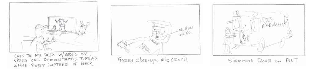 I pitched the idea of an animation project to him without any idea what the subject matter might be. Around this time his Val di Sole crash happened. There wasn’t much information about his condition other than that he had broken his neck and like many fans around the world I was worried. When Greg and I met for a video chat he told me the story of the crash. It was obviously a very serious injury (I could see him uncomfortably talking while in a neck brace) but the way he told the story, and the series of comical things that happened had us both laughing.