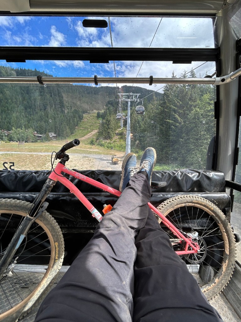 I’ve made a handful of friends up here in Whistler leaning on my old BMX days. That’s fairly normal for me as I’m very rarely outgoing enough to actually meet anyone on my own. Fabes was working behind a bar and recognized me. He took me out on a couple local’s route rides when my bike still had a drivetrain (the gears all rattled off after a few weeks of bike park). Yesterday we did a Top of the World ride with his friend Joel. At Whistler the bulk of the trails I really like (jump trails) are above Whistler Village. With the main lift being replaced this year you take the gondola up to the mid station. That’s where you can pick up A Line, Dirt Merchant and Crank it Up. You can also stay on the gondola and go another 2 times higher on the mountain. There are amazing views up there and sometimes I ride up there just to take those in. I find the trails starting from that area to be kind of boring and tediously bumpy but you have to remember I’m riding a hardtail. There is also another lift that goes even higher than that! This one goes to the Top of the World which is the peak of Whistler mountain. Fully worth doing even without your bike. Walking the sketchy feeling bouncy suspension bridge they have up there is quite an experience.