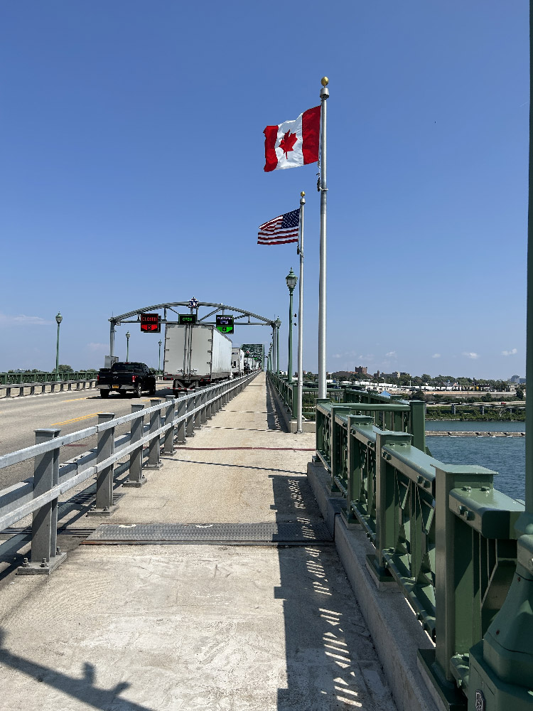 It had been a wonderful day of riding and I was swimming in happy sensations when it came to an abrupt end at the locked door to the USA. I’d ridden across the Peace Bridge from Canada and into Buffalo. It’s a mile long and 170 foot (52m) tall bridge that spans the Niagara River south of the big falls, and it was loaded with stopped and idling semi trucks. The fenced in bike path runs along the roadway guided me past that mess and eventually came to a dead end in at razor wired cage with a locked door and a small sign that read, “PRESS BUTTON FOR IN PECTION.” I gave it a press and nothing happened.