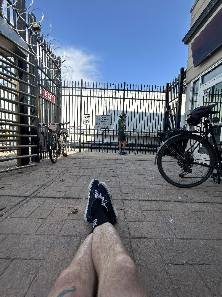 After a short wait I pressed it again and the semi trucks rumble nearby drowned out the feeble and buzzy speaker. “Sorry, I didn’t catch that,” I responded. The voice on the other end that I still couldn’t understand was now clearly annoyed so I just decided to wait. 30 minutes later I buzzed again assuring them I couldn’t hear what they said the first time and the voice was outright angry and yelled something unintelligible back to me. I couldn’t figure out what to do so I sat on the ground inside my little cage wishing I had water and coughing on diesel fumes. Another rider came down 15 minutes later and tried buzzing and got an equally terse response. Were they coming? Are we supposed to just sit here? No clue. Later a 3rd guy got fed up and went back to Canada but after a hour and 45 mins the door finally unlocked.