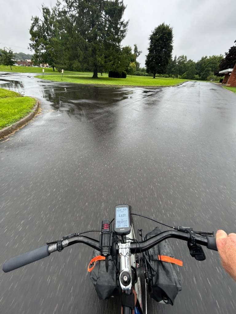 I pedaled out of Kingston this morning just after a hard nighttime rain let up. It let up but never really let go and it was one of those days where there was a light spray in the air at all times. Sometimes it would rain just enough that maybe you’d flip your wipers on if you were in a car, but of course I was on a bike. Luckily it was also rather warm so the ride through the misty spray was border line cool but more or less comfortable.