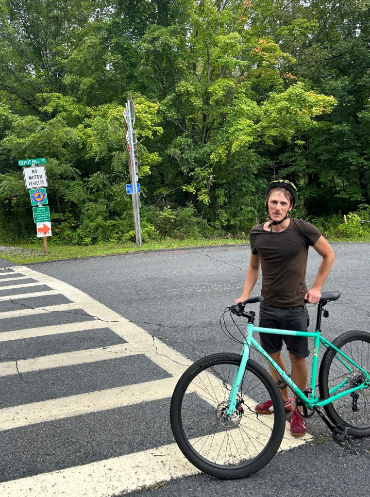 Crossing the Hudson on the Poughkeepsie rail trail bridge is rad! Extremely tall bridge and only pedestrians and cyclists on it. It’s a good thing to check out even if you just walk to the middle and turn around. Kyle was waiting for me on the other side having just climbed up through a bushy hill of bramble because he couldn’t find the trail. Not for the last time today either. Kyle’s never done any touring or longs rides guessing his longest ever ride was 20 miles (32km). He lives in Brooklyn and gets around by bicycle so I was hoping he’d be better suited for this adventure than he realized. He’s riding a Weekender Archer and didn’t have a rack or a water bottle cage. We tied his backpack to my rack and we started pedaling down the trail.