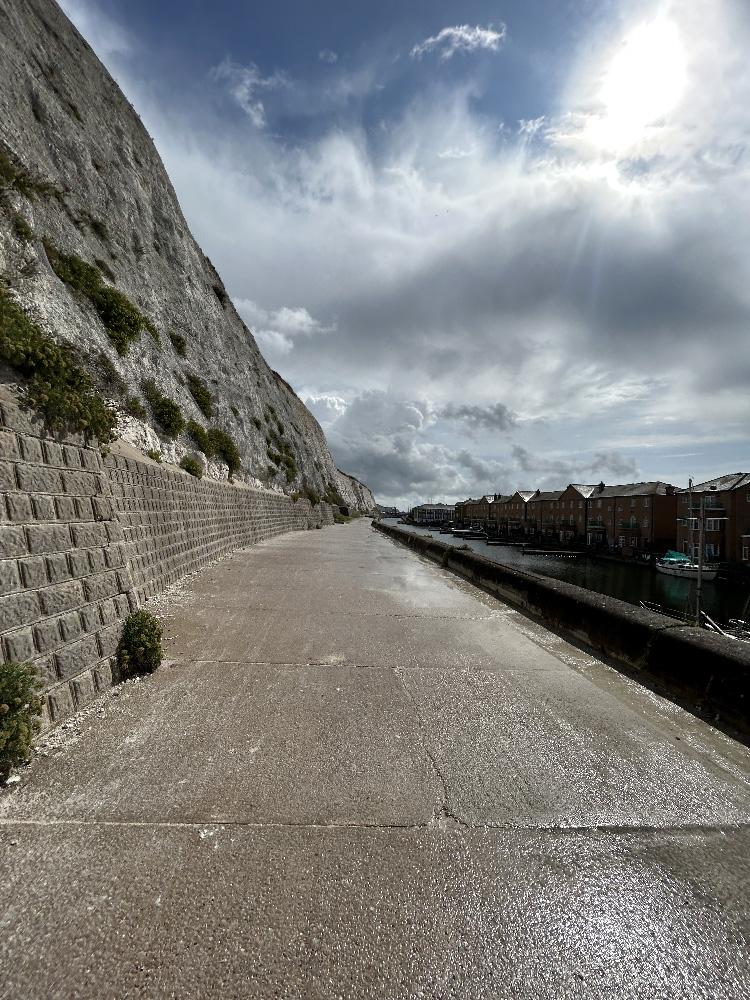 The people thinned out and some construction diversions started to appear. I followed a few older folks who were riding slowly but seemed to know where they were going. One of the women told me she wasn’t a crazy English man out riding in the rain thinking it was great, it was just that next weekend she had to work. I never did ask them if they were going the direction I was hoping to go and just rode with them for a while. Luckily they were headed east along the coast and took me to a section where you ride at the bottom of a white chalky cliff with the sea on the other side of the trail. It wasn’t the famous White Cliffs of Dover, I think it was more like the “Slightly Grayish Cliffs Outside Brighton” but it was awesome. Again I was riding very slowly enjoying the views. I didn’t have far to go today but I could tell it was going to take me all day.