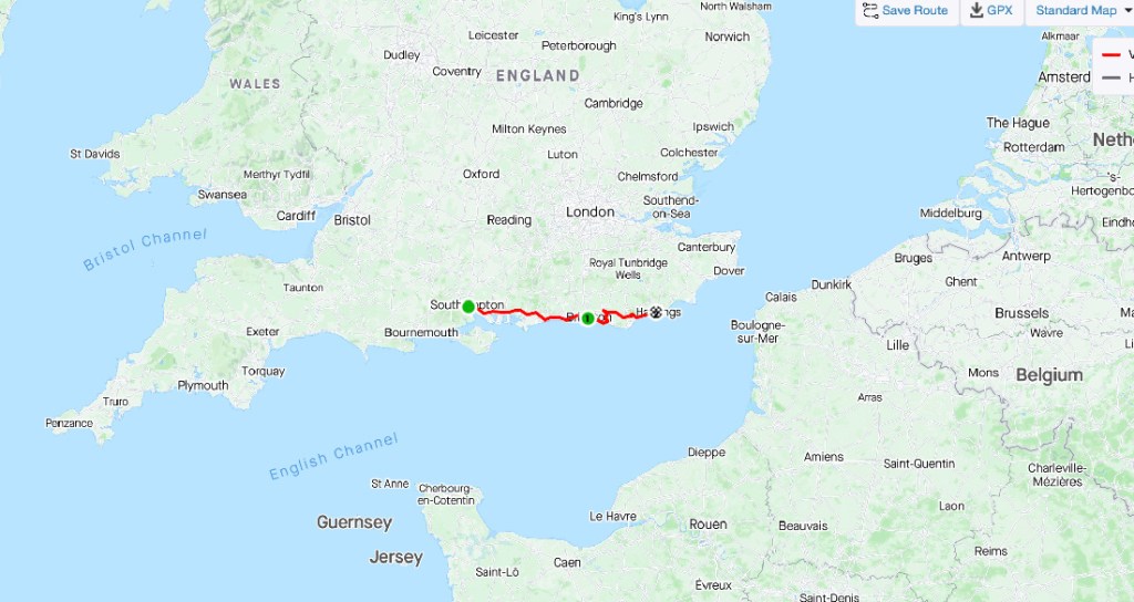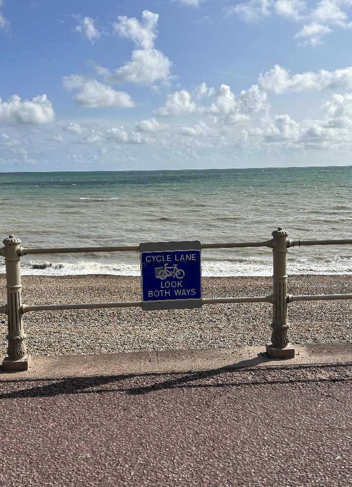 I woke up to some pretty hard rain in Brighton. I fiddled around with my computer and had a slow breakfast hoping the weather would change. Just about at checkout time the rain just about stopped and so I started pedaling. The roads ahead looked busy so I rode along the beachfront. Very slow going dodging all the people walking along but entertaining and of course beautiful to be riding along the seaside.