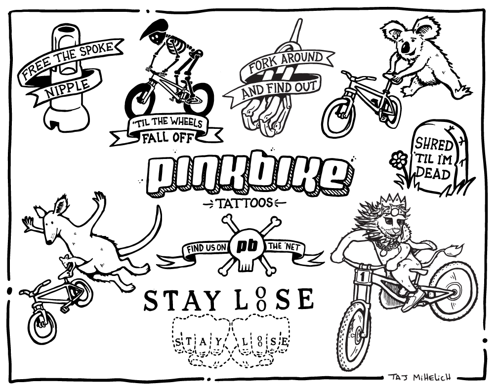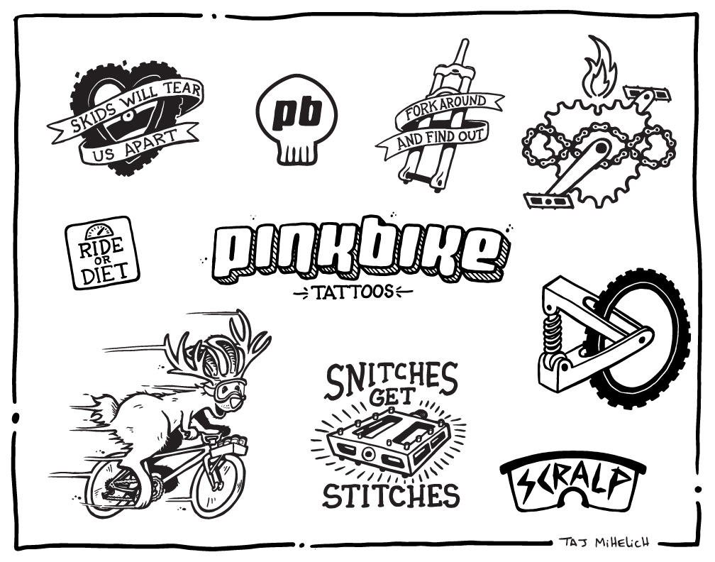 PinkBike gave away tattoos at Crankworx of my cartoons. Like real tattoos that people actually had tattooed on them, forever. I had a real laugh drawing these.